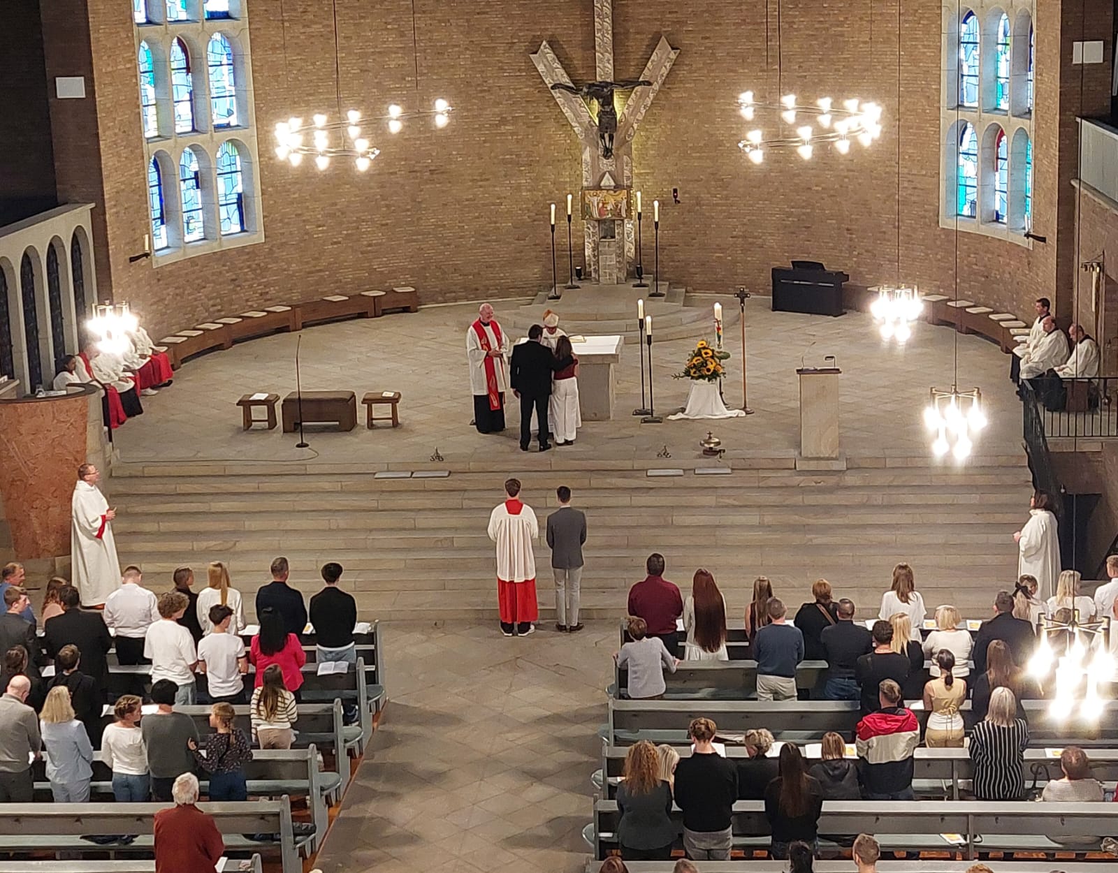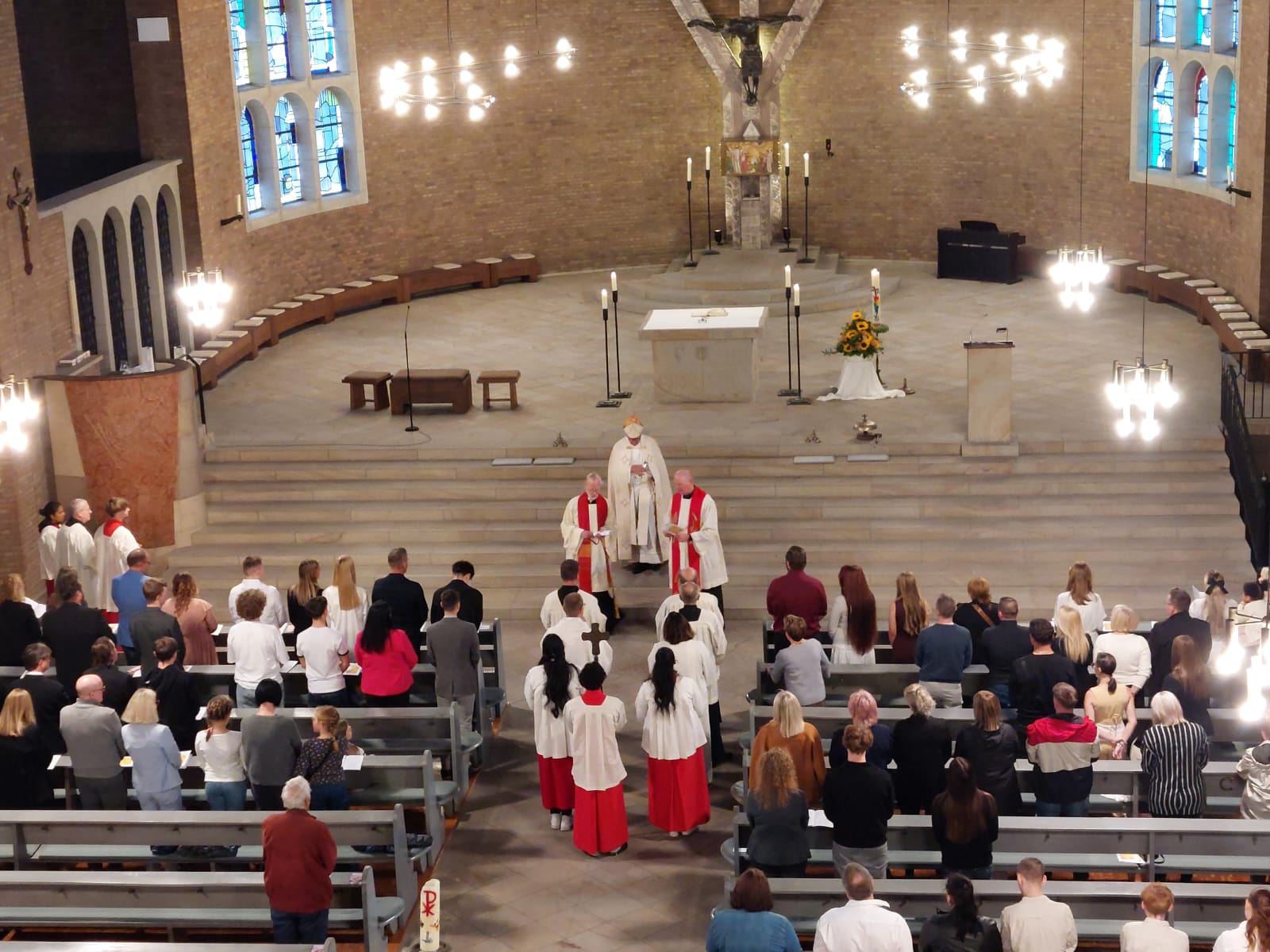 Musikalisch gab es in diesem Gottesdienst eine Premiere. Aus Anlass der Firmfeier taten sich der „Neue Chor der Lydia-Gemeinde“ (unsere evangelische Schwestergemeinde) und die Projektschola unserer Gemeinde unter der Leitung unseres Organisten Manfred Preuß zusammen und sorgten für eine musikalische würdevolle Begleitung des Gottesdienstes. Unter den Sängern war auch Ekkehard Brach, der Pfarrer der Lydia-Gemeinde.
